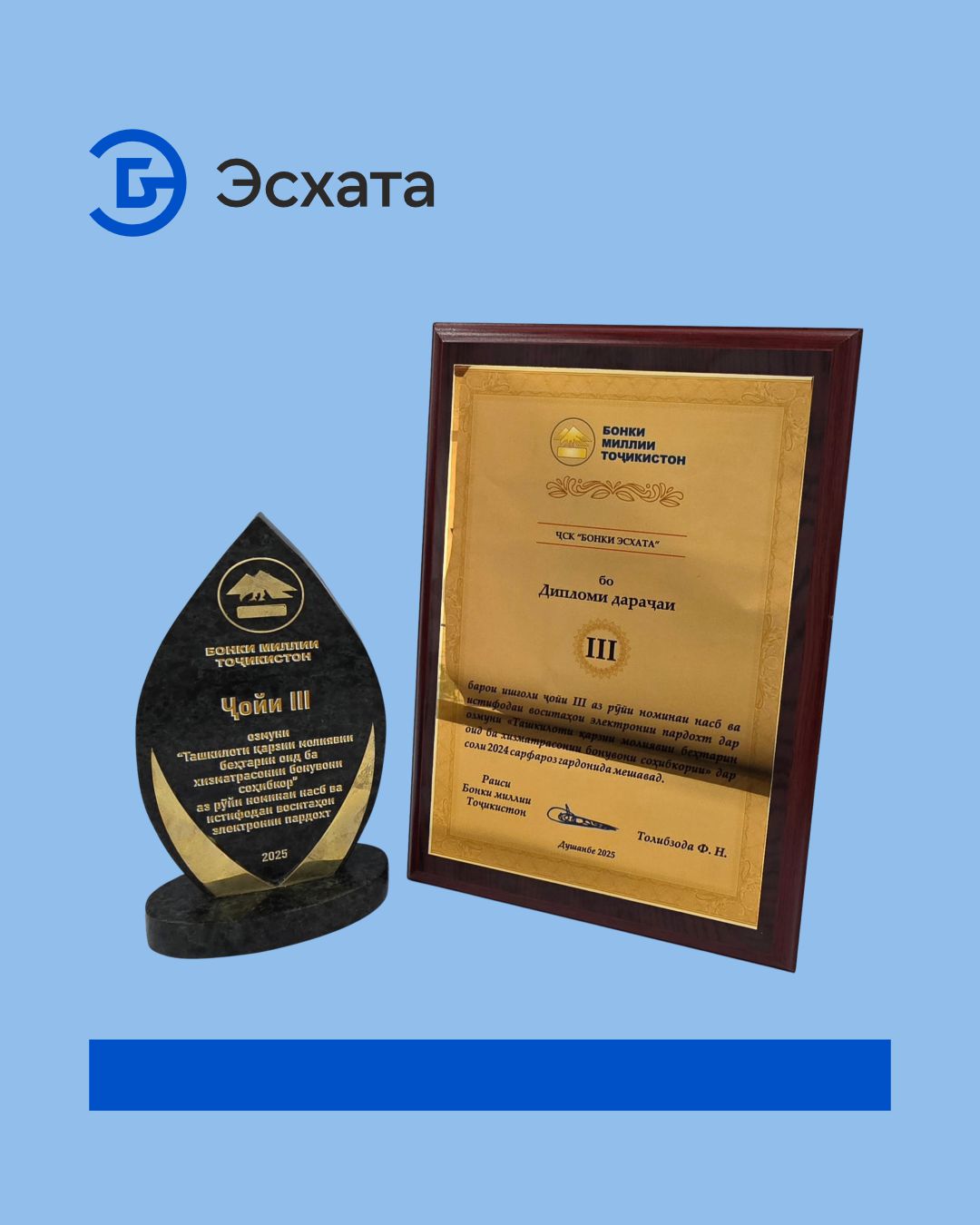 Эсхата Банк вновь был удостоен почетной награды Национального банка Таджикистана в номинации по установке и использованию электронных платежных средств в конкурсе «Лучшее финансовое учреждение по оказанию услуг женщинам-предпринимателям» в 2025 году.