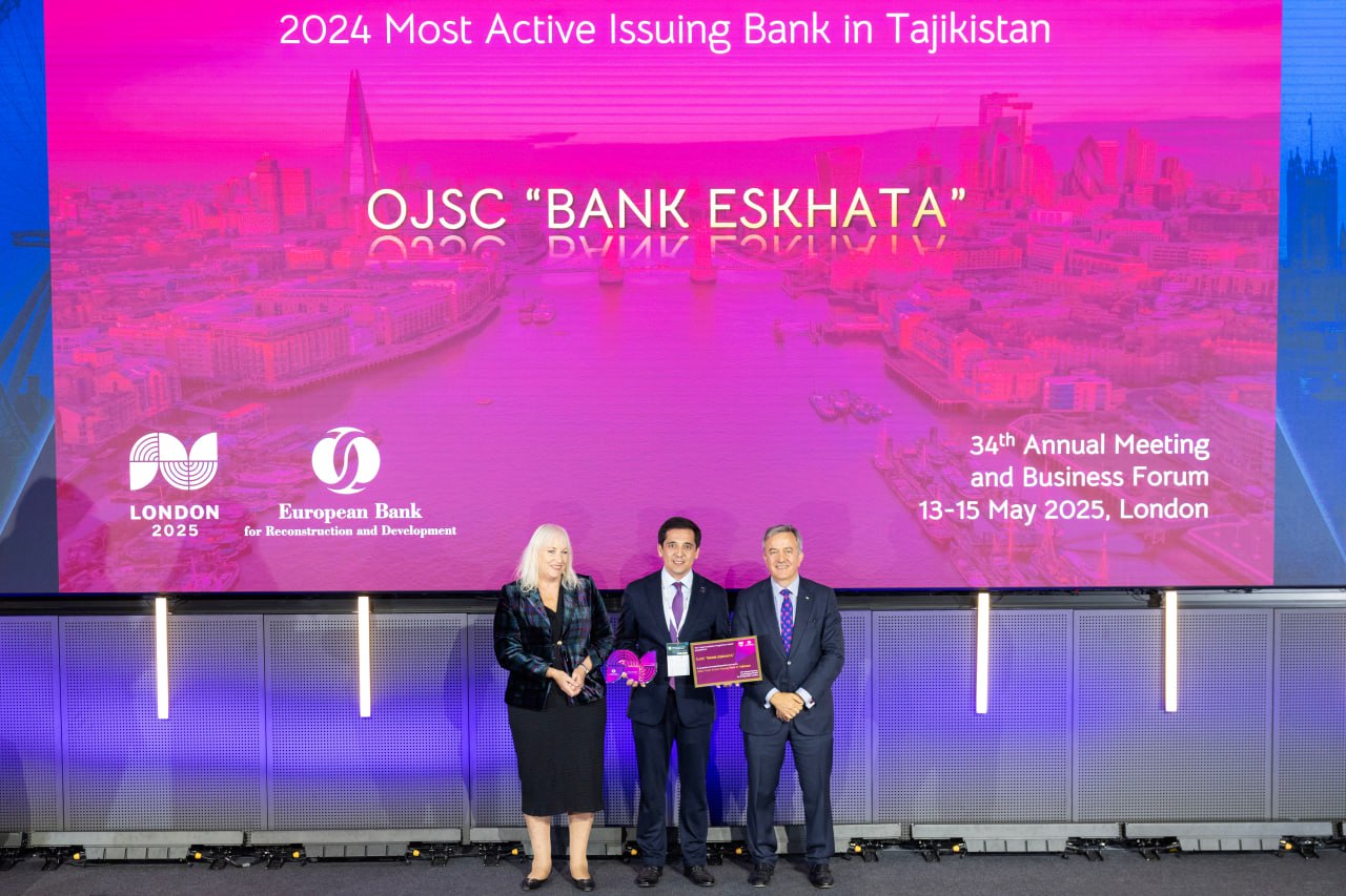 По итогам 2024 года Эсхата Банк в одиннадцатый раз получил престижную награду в номинации «Самый активный банк-эмитент в Таджикистане» Награда была присуждена Европейским Банком Реконструкции и Развития (ЕБРР), в рамках программы по содействию финансирования торговли (TFP).